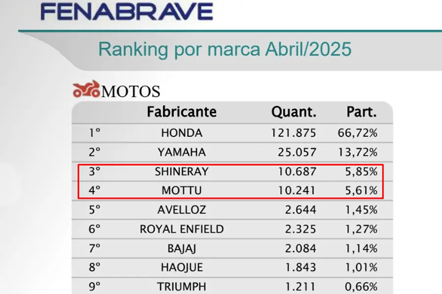 Além da Mottu, outros modelos clássicos da Honda seguem entre os mais vendidos, como a CG 160, a Biz e a Pop 110i, que ocupam o pódio de emplacamentos no mês. A liderança da marca japonesa permanece sólida, enquanto Yamaha, Shineray e novas participantes como a Avelloz tentam ampliar sua fatia no mercado.