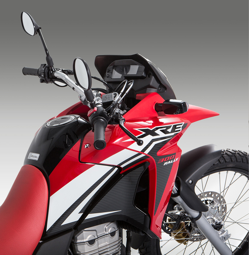 | Nesta foto as novidades da XRE para 2016: nova tampa de combustível, comandos mais modernos nos punhos e um painel inédito do tipo blackout |