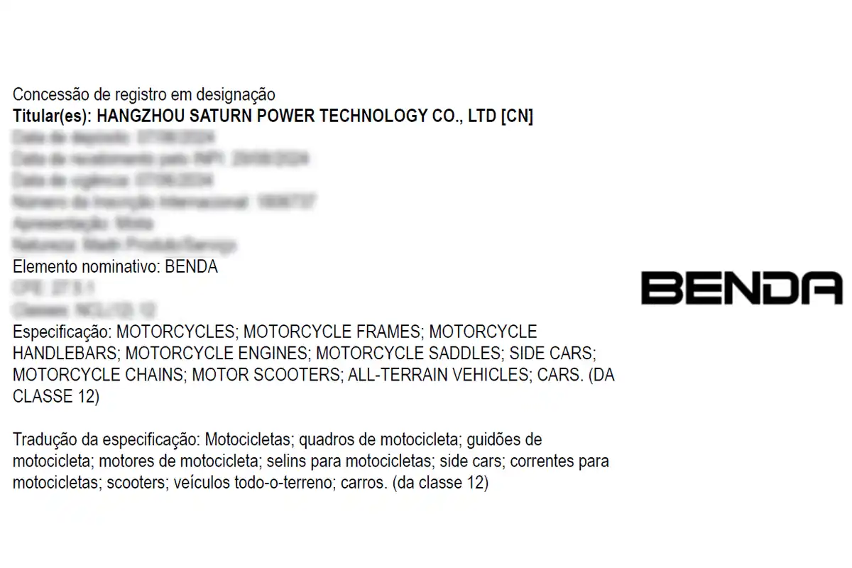 A Benda (Benda Motor Group) teve sua marca registrada oficialmente no Brasil, segundo dados públicos do Instituto Nacional da Propriedade Industrial (INPI). O pedido foi feito pela própria Hangzhou Saturn Power Technology Co., Ltd., empresa responsável pela fabricante chinesa de motocicletas.