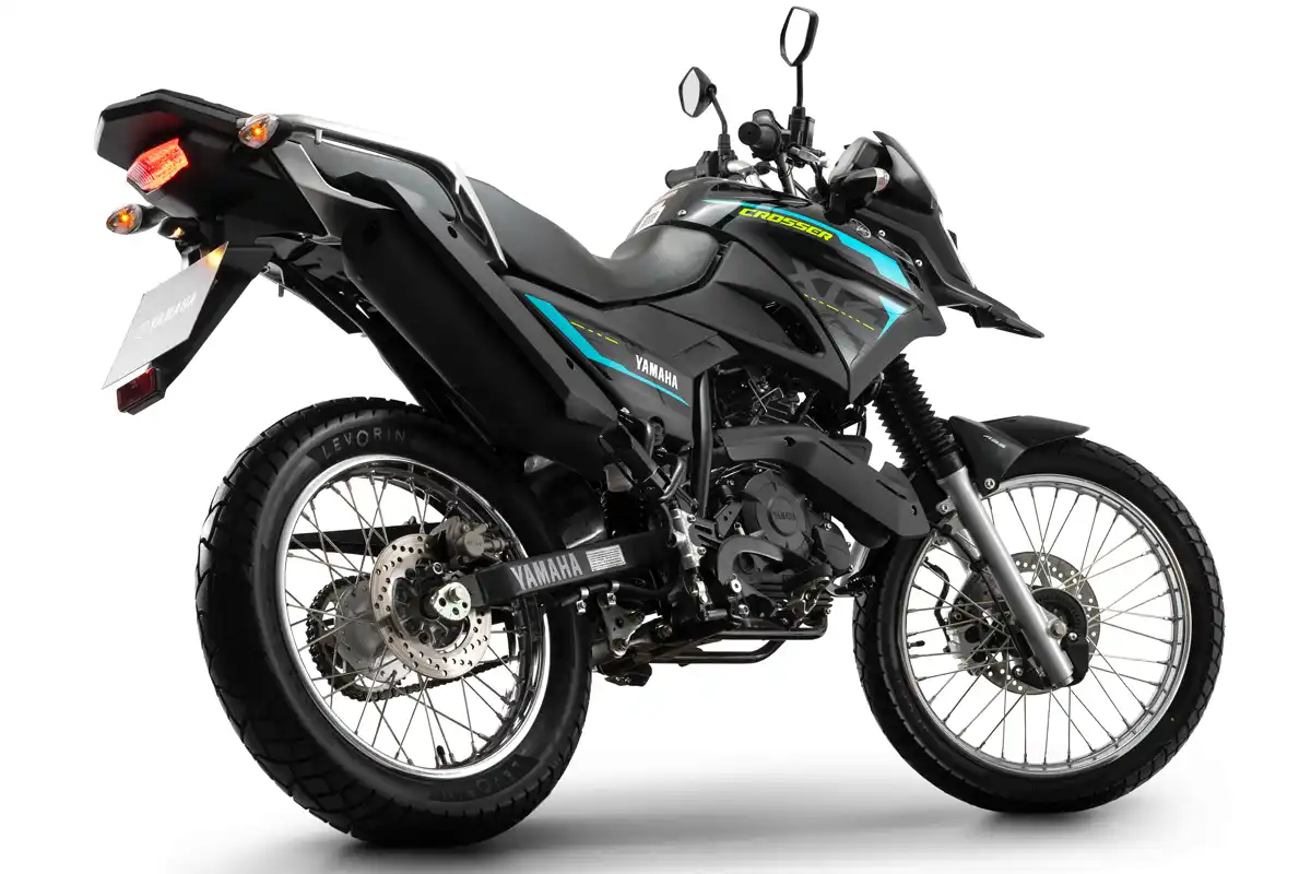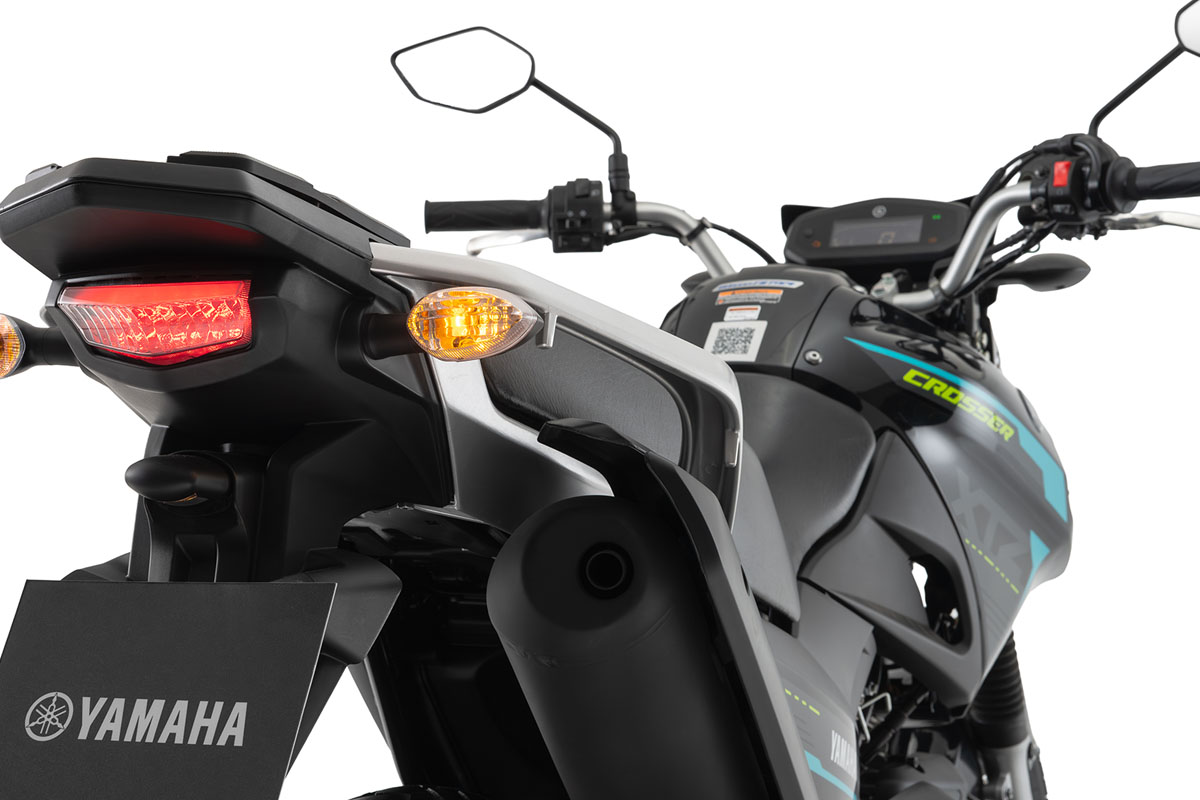 • A Yamaha Crosser 150 S ABS adota para-lama dianteiro baixo e acabamento do motor e da balança na cor preta, com proposta direcionada ao uso urbano.