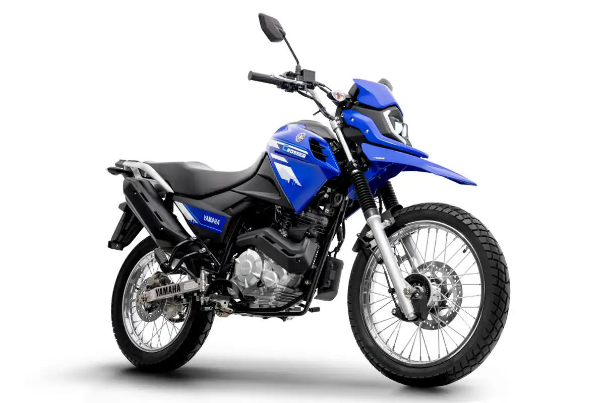 • Já a Yamaha Crosser 150 Z ABS traz para-lama dianteiro elevado e motor na cor prata, característica associada ao estilo trail (leve).