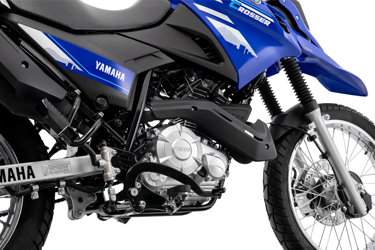 A Crosser 150 2026 continua equipada com motor 150 cc BlueFlex. O propulsor entrega até 11,7 cavalos de potência a 7.250 rpm quando abastecido com etanol e 11,4 cv com gasolina.