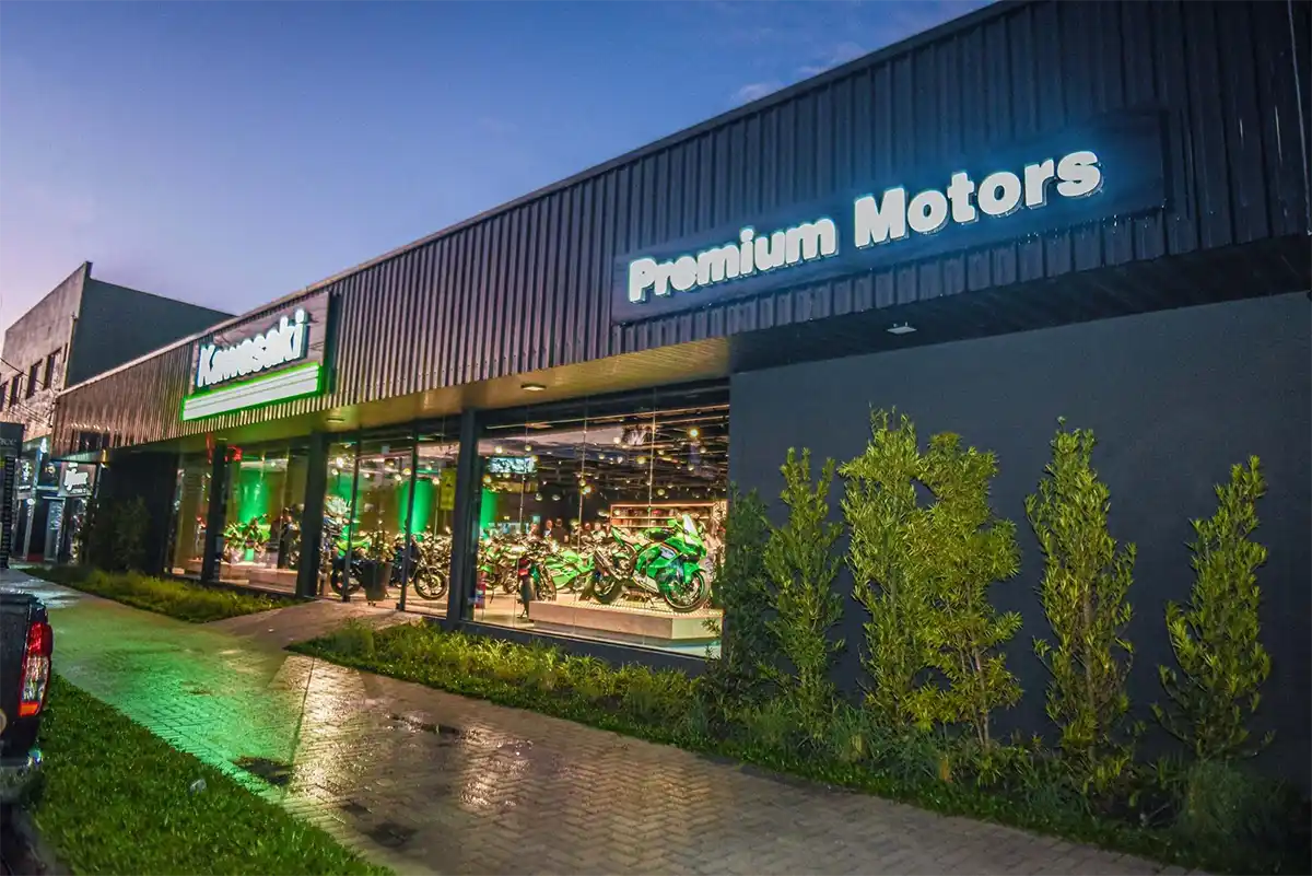 Nova sede da Premium Motors em Curitiba, na Av. Nossa Sra. Aparecida, oferece atendimento padrão global Kawasaki, estacionamento próprio e showroom reconfigurado.