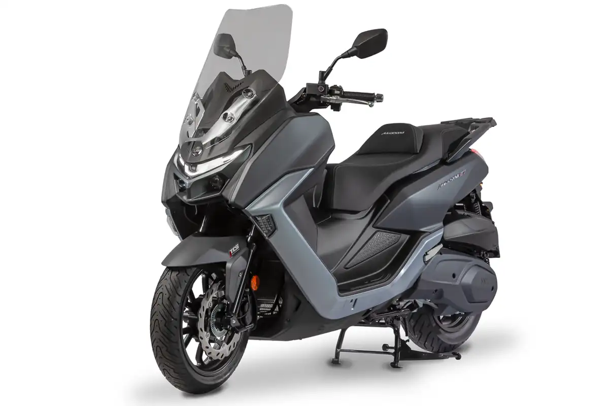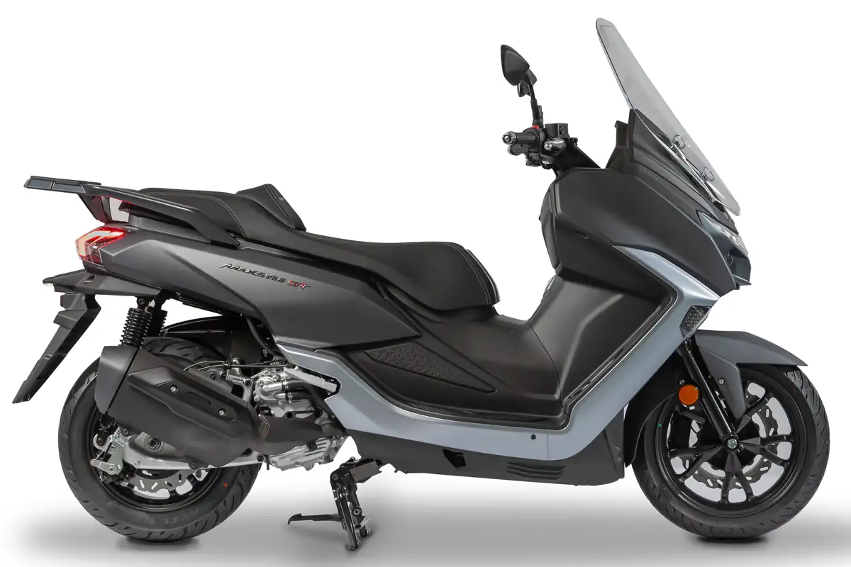 A produção nacional da Maxsym 400 GT acontece em Manaus, e a Dafra disponibiliza o modelo em duas opções de cor, cinza epóxi e preto fosco, disponível nas concessionárias da marca.