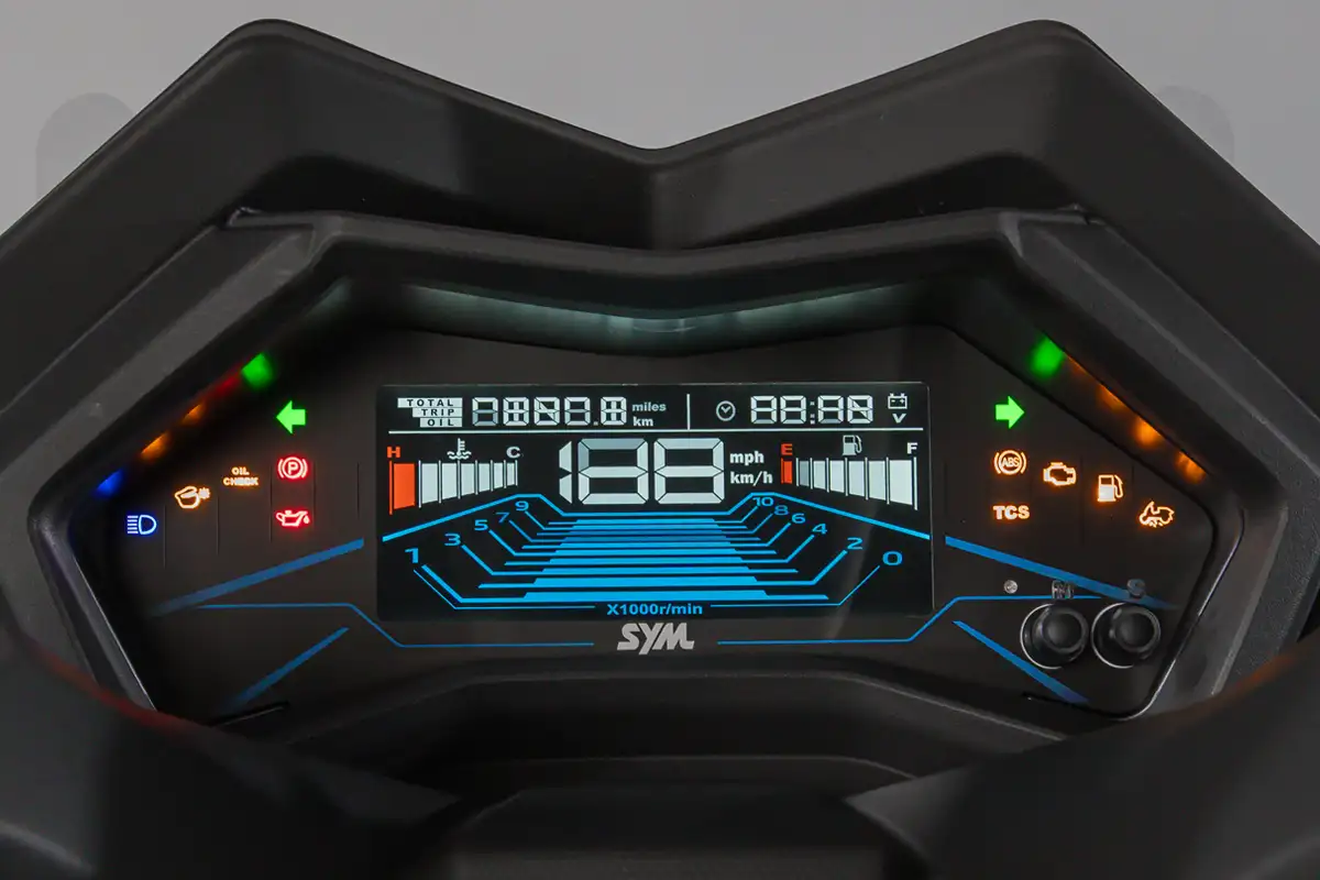 A Maxsym 400 GT apresenta iluminação full LED, painel digital em LCD colorido e chave presencial (keyless), recursos que elevam a experiência de uso e a praticidade no dia a dia.
