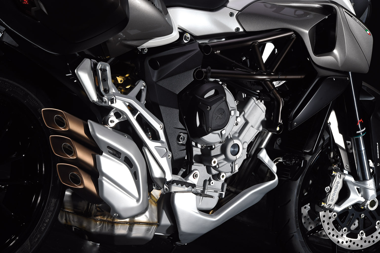 Sem dúvida alguma o grande lançamento da MV Agusta é a crossover Stradale 800, apresentada ao mundo no Salão de Milão e no Brasil no Salão Duas Rodas. De acordo com a fábrica, a Stradale é uma releitura “estradeira” da Rivale 800, construída e projetada para viagens. Por isso, traz quadro especialmente projetado para ela, malas laterais de série com farol e setas integrado, curso de suspensão mais longo e tanque de combustível com 16 litros de capacidade. Tudo pensando para proporcionar uma pilotagem esportiva, com uma “pitada” de touring. Já disponível na Europa e custando 13.990 euros. A Stradale 800 é o primeiro modelo revelado após o anúncio de venda de 25% da MV Agusta para a Daimler AMG, divisão esportiva da Mercedes-Benz.