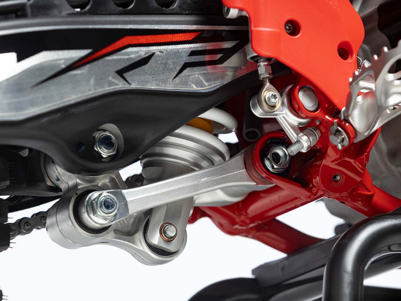Na dianteira, o modelo utiliza suspensão com bengalas de 48 mm e sistema de duplo cartucho. Na traseira, o amortecedor conta com ajustes completos de compressão e retorno, permitindo regulagem conforme o tipo de pista e o peso do piloto.
