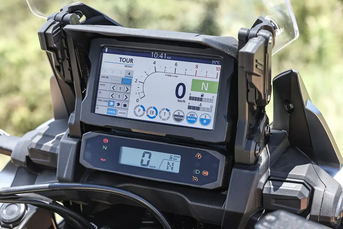 Um dos grandes destaques é a central eletrônica que inclui IMU de seis eixos, ABS de curva, HSTC com sete níveis, Wheelie Control com três níveis e freio-motor ajustável, com suporte a múltiplos cenários de pilotagem.