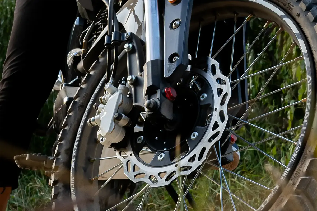 Um dos diferenciais da Shineray SHI 250 é o conjunto de rodas raiadas: aro 21 polegadas na frente e aro 18 atrás. Essa configuração, combinada com pneus de perfil misto (90/90 na dianteira e 120/80 na traseira), é indicada para garantir aderência tanto no asfalto quanto na terra.
