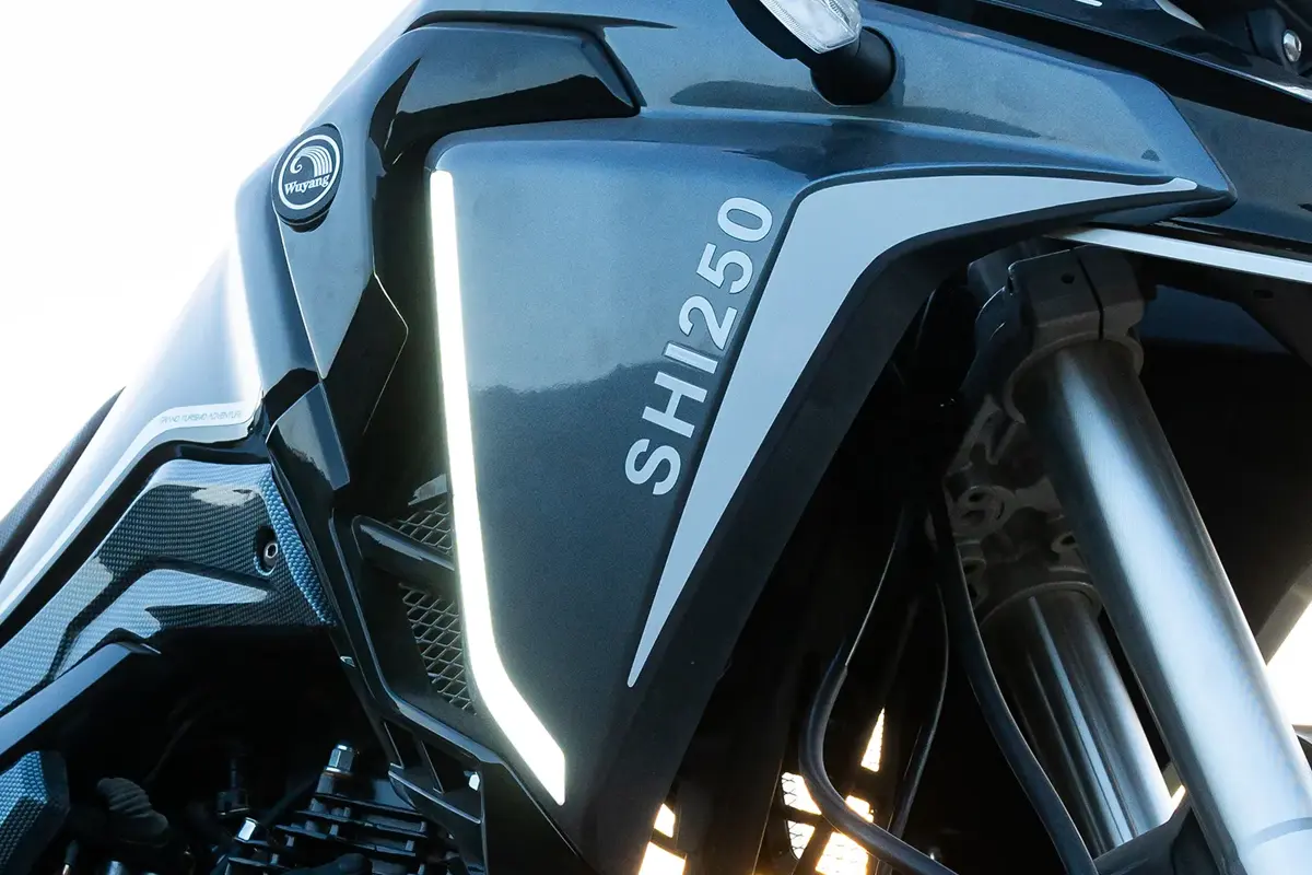 Com 2.140 mm de comprimento e 880 mm de largura, a SHI 250 tem porte semelhante ao de suas concorrentes. O assento está a 870 mm do solo, o que favorece a pilotagem em terrenos acidentados, mas pode representar um desafio para motociclistas de menor estatura. O vão livre do solo de 300 mm também colabora com a capacidade off-road.