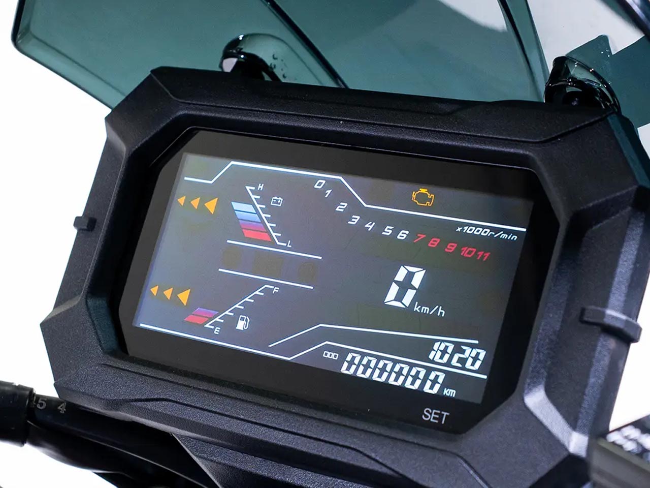 O modelo conta ainda com partida elétrica, ignição digital e sensor de cavalete lateral. Para conectividade, há tomadas USB-A e USB-C, voltadas ao carregamento de dispositivos móveis durante o uso.