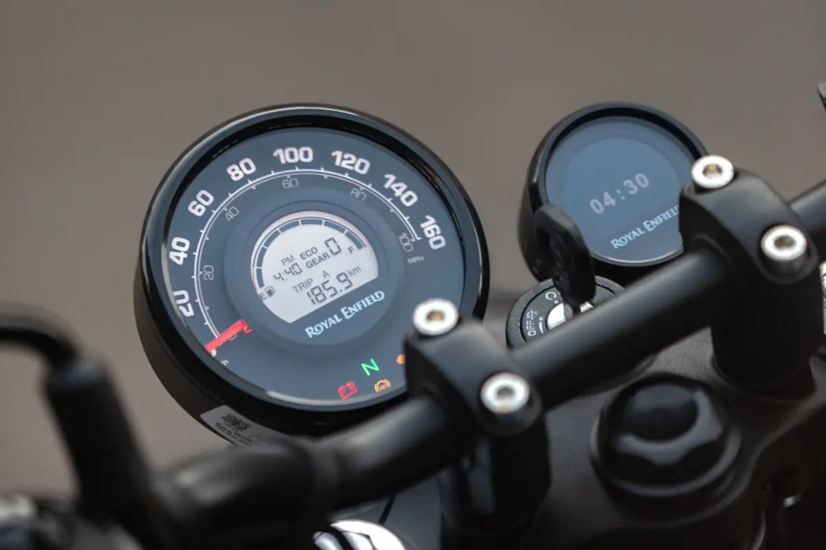 O painel de instrumentos da Hunter 350 mistura elementos analógicos e digitais, oferecendo um velocímetro clássico combinado com uma tela de LCD. O display inclui informações essenciais como hodômetro, indicador de marcha e marcador de combustível. Para os consumidores que optam pela versão Rebel, o modelo ainda conta com o sistema de navegação Tripper, desenvolvido pela própria Royal Enfield, trazendo mais praticidade e tecnologia para a pilotagem.