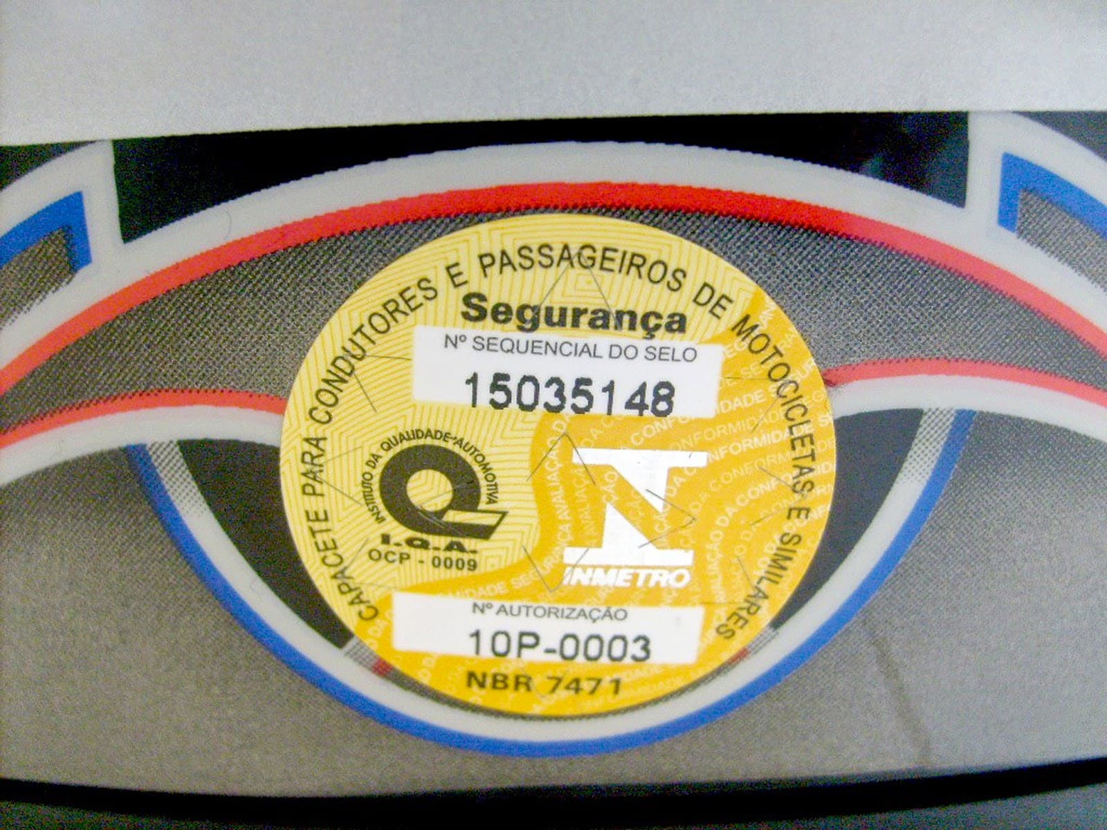 - Na ausência do selo holográfico do INMETRO, a existência da logomarca do INMETRO na etiqueta interna do capacete, conforme a norma NBR 7471;
