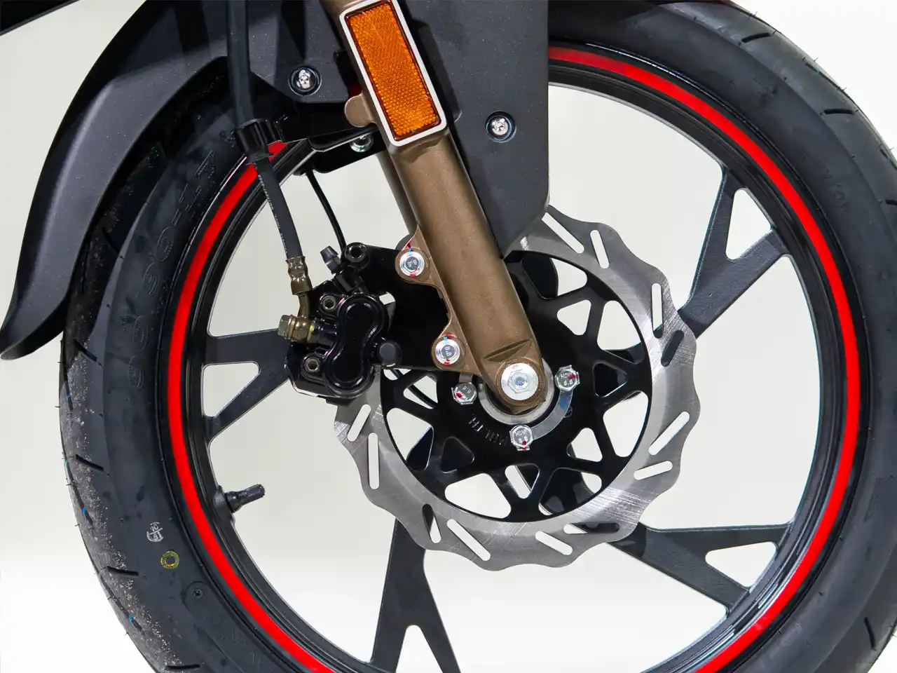 No sistema de freios, a Shineray Jef 150 2026 utiliza disco de 235 mm na roda dianteira e freio a tambor de 128 mm na traseira.