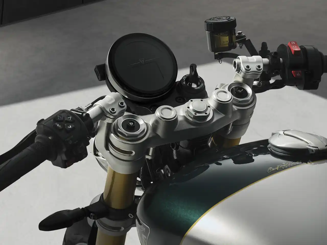 O painel da Speed Twin 1200 Cafe Racer combina uma tela LCD com um display TFT colorido integrado em um mostrador circular. O layout busca preservar a identidade clássica da linha, sem abrir mão de recursos modernos.