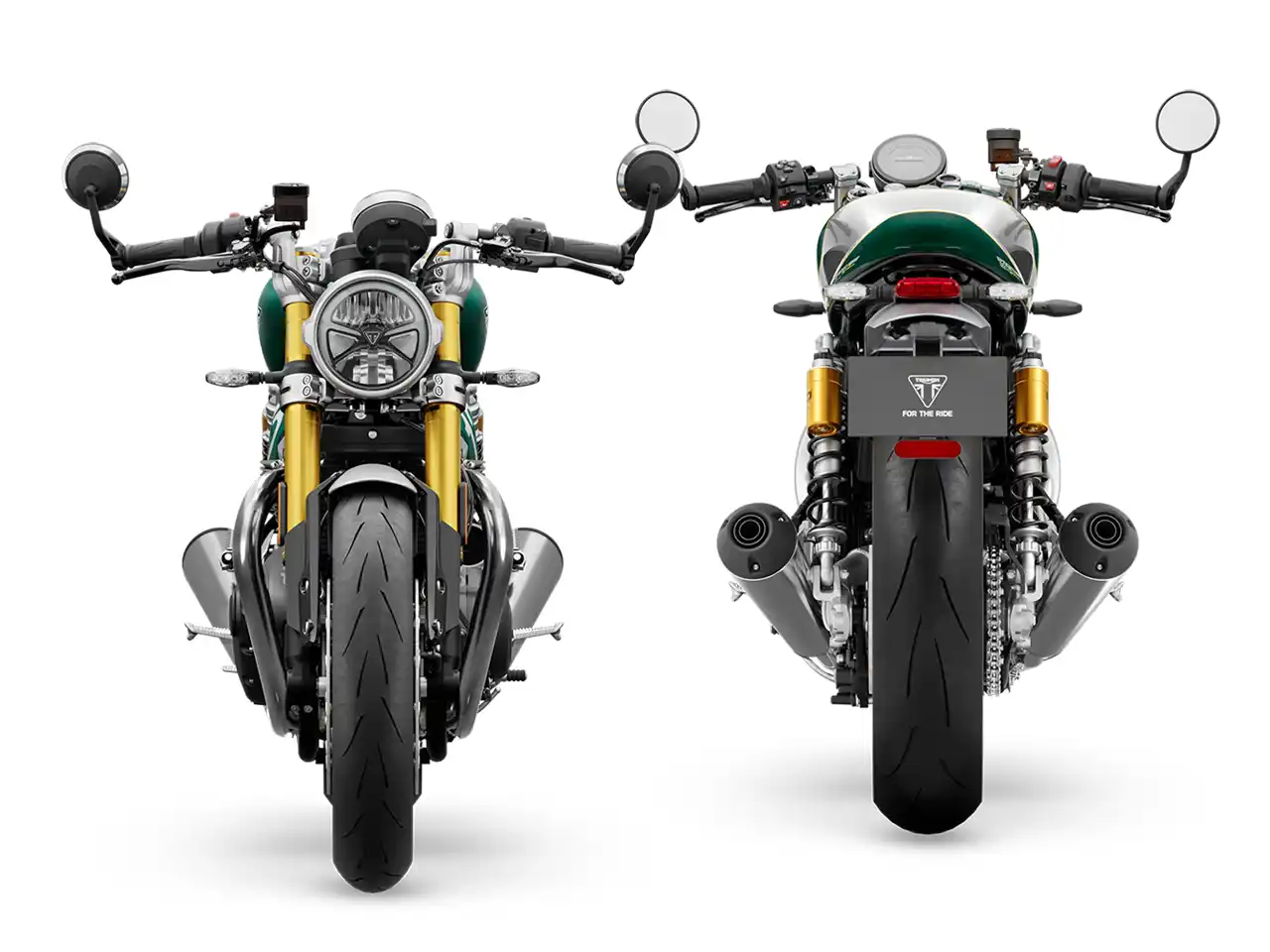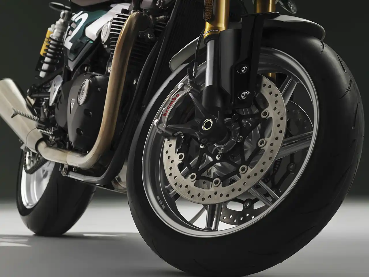 Os pneus são Metzeler Racetec RR K3, com medidas 120/70 R17 na dianteira e 160/60 R17 na traseira, montados em rodas de liga leve de 17 polegadas, configuração mantida na Speed Twin 1200 Cafe Racer.