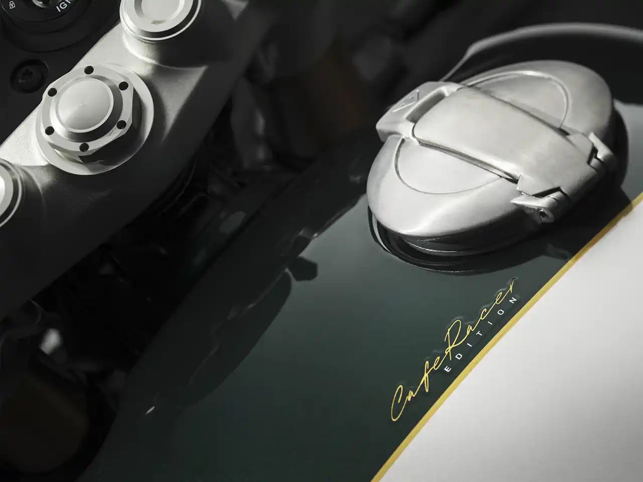 A pintura exclusiva combina as cores Competition Green e Aluminium Silver, inspiradas no tradicional British Racing Green. Filetes decorativos na cor Empire Gold delimitam as áreas de pintura e estão presentes no tanque e em outros componentes visuais.