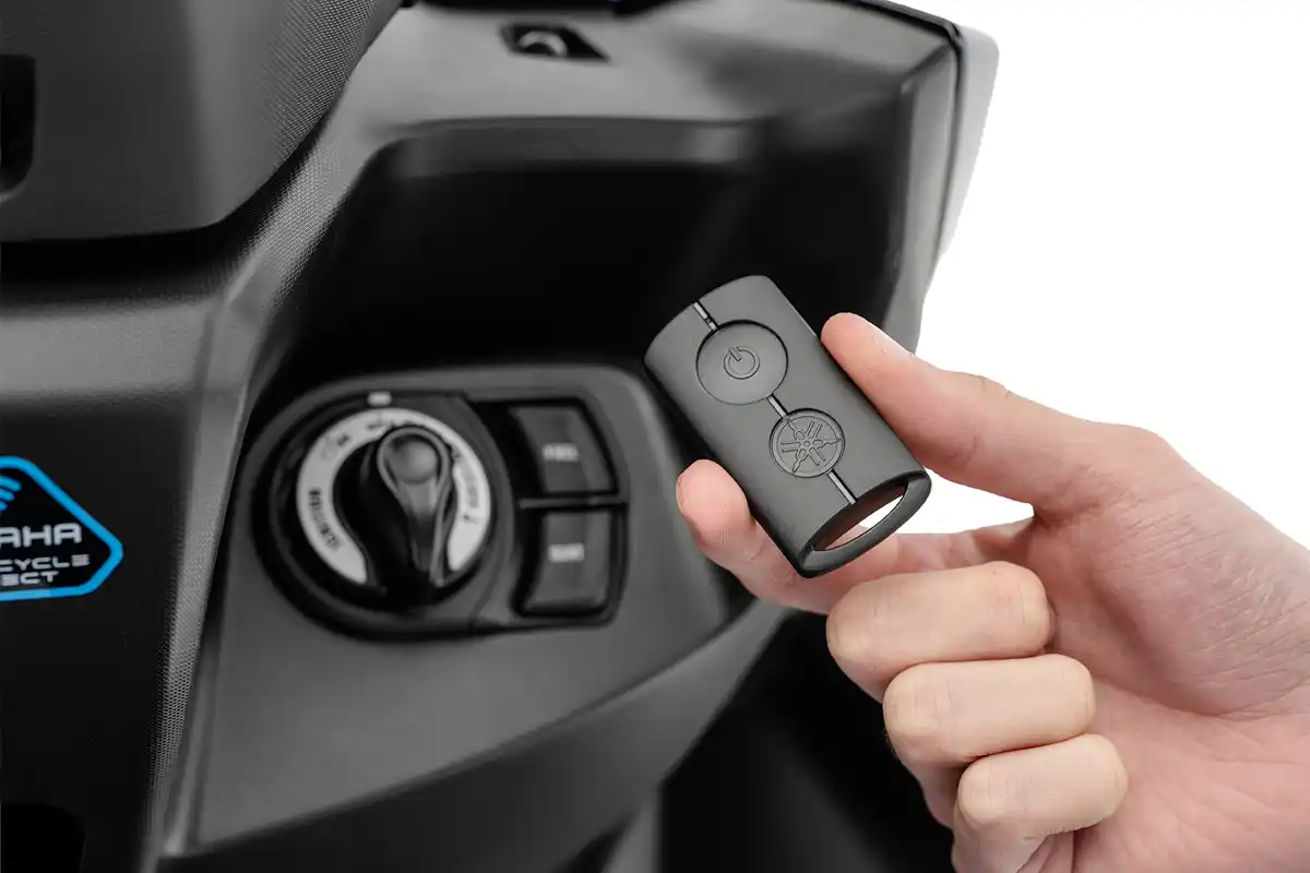 A Yamaha Aerox ABS também incorpora o sistema Smart Key, que permite ligar o veículo por aproximação da chave presencial. O conjunto inclui ainda o recurso Answer Back, que facilita a localização da scooter em estacionamentos ao acionar sinais luminosos e sonoros.